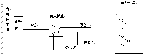 見上圖,預(yù)留告警接口通過4蕊電話線連到美式插座,再與通信設(shè)備相連。其接口定義見圖示。注意:告警器輸入 定義為"閉合告警",即輸入線與公共線相連時(shí),表示有告警。因此應(yīng)與所連設(shè)備告警輸出繼電器的常開接點(diǎn)相連。