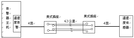 溫、濕度傳感器通過四蕊電話線與告警器主機(jī)相連。兩者距離很近時(shí),將傳感器接線插入主機(jī)溫、濕度告警接口即可。若距離不夠長時(shí),可按上圖一對一的加長連線,連線距離可達(dá)3公里。
