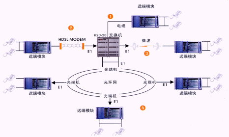 遠端模塊通過標準2M(E1)接口與交換機連接。該接口不受傳輸距離和傳輸設(shè)備的限制。常用的傳輸設(shè)備有SDH、PDH光端機(光纜),數(shù)字微波、數(shù)字擴頻,HDSL調(diào)制解調(diào)器(雙絞線)等。