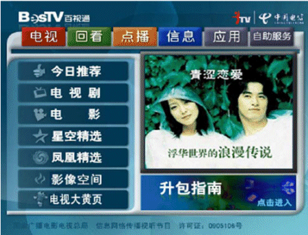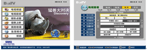 上海IPTV業(yè)務(wù)自2006年9月1日放號(hào)以來(lái),發(fā)展十分迅速。截止10月7日,上海電信IPTV業(yè)務(wù)共計(jì)發(fā)展用戶達(dá)2.2萬(wàn)。如下是上海IPTV商用系統(tǒng)EPG頁(yè)面: