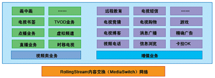 奔流(RollingStream)系統(tǒng)不僅僅支持以LiveTV、Timeshift-TV、VOD、TVOD等為基礎(chǔ)的各項(xiàng)功能,而且具有良好的功能上的可擴(kuò)展性,在此平臺(tái)上可以支持眾多豐富多彩的增值互動(dòng)業(yè)務(wù)。基于奔流(RollingStream)具有無(wú)限的業(yè)務(wù)增長(zhǎng)空間,如下圖所示意: