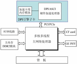 UT斯達(dá)康CCG處理刀片在通用的TC8000業(yè)務(wù)刀片上進(jìn)行了增強(qiáng),DPI采用了增強(qiáng)的64位MIPS64?多核處理器與專(zhuān)業(yè)ASIC芯片相結(jié)合的方案,如圖3所示。由于單純的多核處理器在密集運(yùn)算數(shù)據(jù)處理時(shí)動(dòng)態(tài)功耗會(huì)不斷增加,UT斯達(dá)康CCG解決方案中,DPI處理時(shí)會(huì)將主處理器的一部分負(fù)荷卸載到專(zhuān)用ASIC芯片中,來(lái)降低核心主芯片的功耗,一方面保證了主處理器在較低頻率工作時(shí)大幅降低系統(tǒng)總功耗,另一方面通過(guò)釋放主處理器提升了整個(gè)系統(tǒng)的性能。