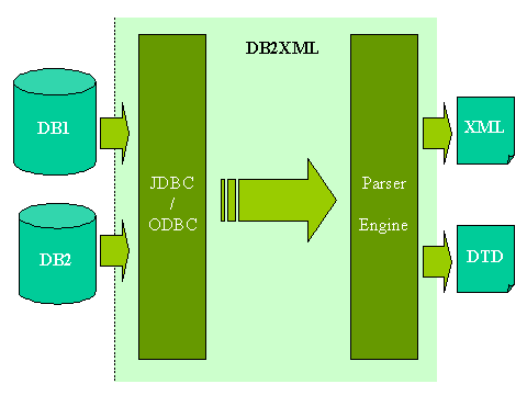 DB2XML中通過JDBC或JDBC-ODBC橋接各種現(xiàn)存的數(shù)據(jù)庫(kù),訪問數(shù)據(jù)庫(kù)中的表;通過XML parser構(gòu)造出代表數(shù)據(jù)庫(kù)內(nèi)容的XML文件。DTD文件描述了從數(shù)據(jù)庫(kù)中的表到XML文件的對(duì)應(yīng)關(guān)系。上圖描述了DB2XML的輸入輸出關(guān)系。事實(shí)上DB2XML是按照以下步驟完成轉(zhuǎn)化工作的: