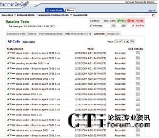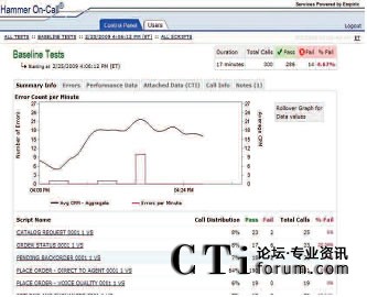 只需使用一個(gè)簡(jiǎn)單易用的Web接入就可以和Empirix測(cè)試小組一起實(shí)時(shí)跟蹤測(cè)試進(jìn)度。此外,還同時(shí)可以查看測(cè)試結(jié)果、發(fā)生失敗的類型和導(dǎo)致失敗發(fā)生的測(cè)試流量。通話全程記錄功能可以用來記錄相關(guān)通話,從而捕獲和幫助診斷發(fā)生失敗的根源。可以參考下列圖表: