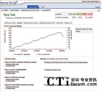 Hammer On-Call IVR測(cè)試使用各種各樣的主叫場(chǎng)景模擬真實(shí)世界用戶交互。通過改變呼叫量和呼叫場(chǎng)景的混合,Empirix測(cè)試專家可以生成指向IVR的模擬真實(shí)世界的呼叫流量。此外,在測(cè)試中,不同的呼叫測(cè)試點(diǎn)上可以使用不同的呼叫率。在測(cè)試過程中經(jīng)常會(huì)用到三種基本呼叫模型及其變體。基本測(cè)試是使用一個(gè)恒定的低呼叫率檢驗(yàn)被測(cè)環(huán)境是否已準(zhǔn)備好接受呼叫;增量測(cè)試是使用一個(gè)固定增量穩(wěn)步增加呼叫量一直到達(dá)峰值呼叫量,然后,增加呼叫量直至超過期望值,檢驗(yàn)系統(tǒng)在峰值時(shí)段內(nèi)是否有額外容量;最后,‘浸透’測(cè)試是在指定的時(shí)段內(nèi)使用一個(gè)恒定的高呼叫率檢驗(yàn)系統(tǒng)穩(wěn)定性。