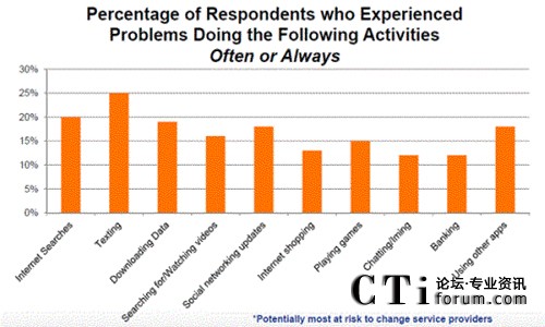 調(diào)查顯示,超過(guò)2/3的美國(guó)智能手機(jī)用戶(hù)從事一些最常見(jiàn)的活動(dòng)時(shí),遭遇了網(wǎng)絡(luò)服務(wù)問(wèn)題,包括互聯(lián)網(wǎng)搜索、數(shù)據(jù)下載、搜尋或觀(guān)看視頻和社交網(wǎng)絡(luò)。此外,在調(diào)查中發(fā)現(xiàn),當(dāng)他們遇到服務(wù)和中斷問(wèn)題時(shí),消費(fèi)者把責(zé)任歸罪于他們的移動(dòng)網(wǎng)絡(luò)運(yùn)營(yíng)商商(MNO)。事實(shí)上,幾乎所有被調(diào)查的智能手機(jī)用戶(hù)的一半,由于他們的體驗(yàn)問(wèn)題抱怨他們的移動(dòng)網(wǎng)絡(luò)運(yùn)營(yíng)商商(MNO)。