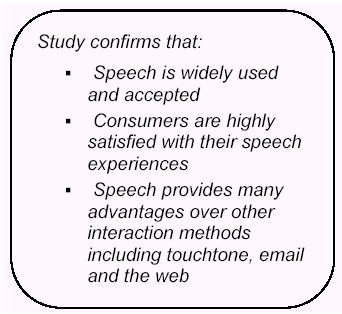調(diào)查結(jié)果無(wú)可厚非地證明語(yǔ)音服務(wù)系統(tǒng)已被大部分消費(fèi)者接受和使用,并且對(duì)其服務(wù)有著高度評(píng)價(jià),它顯示了其他溝通方式,包括傳統(tǒng)的DTMF按鍵式系統(tǒng),電子郵件及互聯(lián)網(wǎng)絡(luò)服務(wù)等所不能比擬的極度優(yōu)勢(shì)。