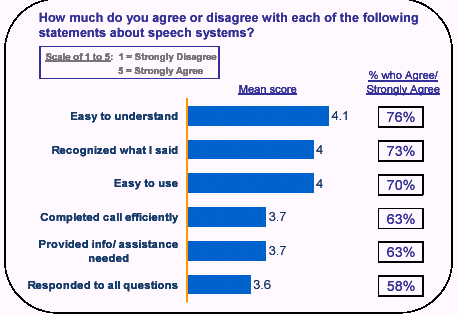 被訪問(wèn)者們例舉了語(yǔ)音系統(tǒng)的很多優(yōu)點(diǎn)。超過(guò)75%的人認(rèn)為語(yǔ)音服務(wù)方便易用,有三分之二的使用者說(shuō)語(yǔ)音服務(wù)不僅為他們提供了準(zhǔn)確的信息同時(shí)也為他們節(jié)省了等待客戶服務(wù)員的時(shí)間。