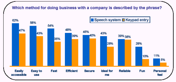 此外,十個(gè)人中九個(gè)人認(rèn)為他們從使用語(yǔ)音服務(wù)中得到了在鍵盤(pán)式服務(wù)中得不到的價(jià)值不菲的好處,并有70%的人說(shuō)如果語(yǔ)音服務(wù)系統(tǒng)取代了按鍵式系統(tǒng)的話,他們的效率也將得以提高。