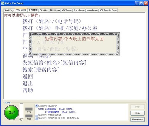 Nuance:可以修改。到你需要修改的那個(gè)“見”上,你再說“見”或者見面,它就給你弄過來了。但是我們覺得在中國區(qū),在中文的修改上,這未必可能是個(gè)好辦法,我們也在試探另外一種辦法,這個(gè)辦法我現(xiàn)在可以給大家介紹一下。就是這樣,我要說修改,那么那個(gè)語音合成TS就開始給你再讀,剛才不是讀了一遍嗎,它再給你讀,但是這一次讀,它是一個(gè)詞一個(gè)詞地讀。他說,今天我不吭聲,晚上,我不吭聲,他說七點(diǎn),我也不吭聲,等他說“見”的時(shí)候,我說“見面”,他知道我說的這個(gè)詞要把那個(gè)覆蓋掉,再改,再把它改了。這樣可能更合理一些,就是你手不用去摸什么東西,眼睛看什么東西,完全能保持你在駕駛的時(shí)候,這是我們目前還在進(jìn)行開發(fā)的一個(gè)東西,或許下一次如果我們?cè)儆袡C(jī)會(huì)我們就可以把這個(gè)演示一下。