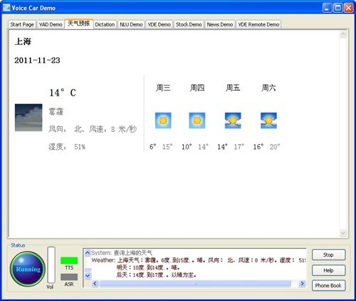 比方說這個(gè)關(guān)于空調(diào)問題,我們過去,空調(diào)的命令詞是“把空調(diào)打開,空調(diào)溫度提高3度!爆F(xiàn)在我也可以這樣說,空調(diào)調(diào)高一點(diǎn),我有點(diǎn)冷,也可以。就是你在車?yán)镞呁耆梢杂媚阕约旱恼Z言來說你想干的事。比如說,前邊你不知道明天天氣會(huì)怎么樣,人一般都會(huì)想想,明天天氣如何,或者是告訴我天氣預(yù)報(bào)。但是你也可以這樣說。明天會(huì)下雨嗎?也可以這樣說;蛘吣氵@樣說,你說,今天大盤怎么樣。完全是用自然語言來說。堵不堵車,“查詢交通情況!边@就是,實(shí)際上可以有各種不同的說法來完成這個(gè)任務(wù),這是我們自然語言的一個(gè)演示。