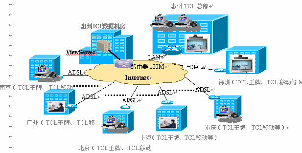 TCL集團利用ViewMeeting實現(xiàn)可視協(xié)同辦公系統(tǒng)的組網(wǎng)圖: