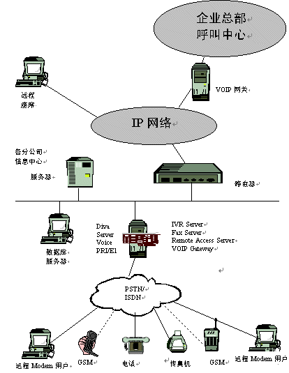 隨著信息技術(shù)的發(fā)展,企業(yè)對(duì)通訊的需求越來越多,并越來越呈現(xiàn)多樣性,有語音通訊,傳真通訊,數(shù)據(jù)通訊等。我們拿銀行作為一個(gè)例子來分析,目前我國(guó)大多數(shù)大型商業(yè)銀行都在各個(gè)市(甚至縣)建有一個(gè)IVR交互式語音應(yīng)答系統(tǒng)以滿足其客戶的語音查詢需求;同時(shí),系統(tǒng)也要具備傳真通訊功能,以滿足某些大客戶需要傳真回復(fù)確認(rèn)的需求;目前,各個(gè)商業(yè)銀行也建立了自己的企業(yè)銀行平臺(tái),所以中心也需構(gòu)建一個(gè)接入服務(wù)器來滿足某些大客戶的遠(yuǎn)程撥號(hào)接入進(jìn)行遠(yuǎn)程交易;隨著Call center 應(yīng)用的興起,各商業(yè)銀行的省行呼叫中心需要將其各市行的語音接入平臺(tái)(IVR),通過VoIP 技術(shù),接入到省行的Call Center 中心,從而建立一個(gè)分布式的Call Center,以提高對(duì)其客戶服務(wù)的滿意度 。