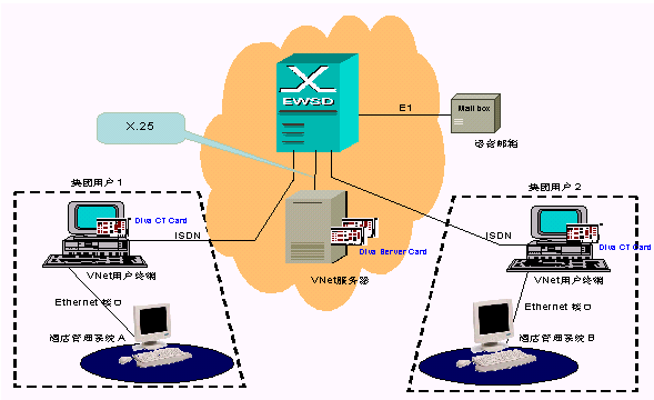 EWSD交換機(jī)提供的增強(qiáng)型CENTREX(虛擬集中用戶交換業(yè)務(wù))業(yè)務(wù)平臺(tái)VNet,能夠使運(yùn)營(yíng)商在PSTN公網(wǎng)中向大客戶和重要客戶提供性能與用戶交換機(jī)PBX相似的集團(tuán)用戶解決方案.由于VNet功能基于EWSD交換機(jī), 因此能提供給用戶最大的可靠性.利用VNet豐富的性能和EWSD靈活的組網(wǎng)方案,在保證VNet的CERNTREX用戶享有PSTN公網(wǎng)的所有性能的同時(shí),可以根據(jù)用戶的特定需求提供有針對(duì)性的解決方案,完全滿足集團(tuán)用戶,商業(yè)用戶的通信需要. 此系統(tǒng)應(yīng)用了Eicon公司性能卓越的Diva ISDN Server系列產(chǎn)品。網(wǎng)絡(luò)應(yīng)用如圖所示: