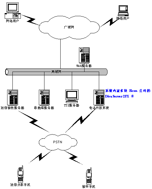 點歌用戶從手機(jī)短信或web頁上發(fā)送點歌訂單后,系統(tǒng)通過短信接收服務(wù)器或Web服務(wù)器接收訂單,通過局域網(wǎng)在歌曲庫服務(wù)器中找到要點播的歌曲,再將要播放的歌曲交由電話外撥系統(tǒng),電話外撥系統(tǒng)會將所有的歌曲訂單進(jìn)行先進(jìn)先出排隊,播放到用戶手機(jī)上同時通過TTS播放用戶的姓名,及手機(jī)號碼