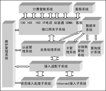 綜合付費平臺的軟件邏輯結(jié)構(gòu)分為語音接入處理子系統(tǒng)、Internet 接入子系統(tǒng)、接入適配網(wǎng)關(guān)子系統(tǒng)、認證管理子系統(tǒng)、業(yè)務處理系統(tǒng)、卡管理系統(tǒng)、分銷商管理系統(tǒng)、查詢統(tǒng)計系統(tǒng)、數(shù)據(jù)庫系統(tǒng)、接口網(wǎng)關(guān)子系統(tǒng)和維護管理子系統(tǒng)。