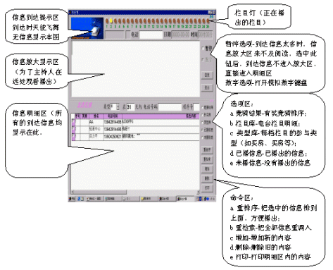 如果信息到達量過大,會導致信息放大區(qū)中的信息不斷被更新,此時,只要選中暫停選項,信息放大區(qū)的信息就不會被更新。該信息播出后,如果需要播出明細區(qū)中的內(nèi)容,只要在明細區(qū)中用鼠標左鍵雙擊該信息的信息內(nèi)容,該信息內(nèi)容立即上升到放大區(qū)中,同時該信息發(fā)送人的姓名、性別、電話、日期、時間會同時上升到放大區(qū)上方,而且該信息內(nèi)容會自動轉(zhuǎn)移到已播出信息中(這樣可以迅速明細區(qū)中的信息減少,方便主持人播出其他信息)。