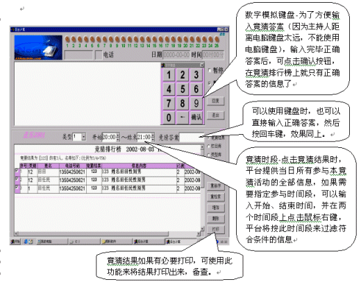 竟猜前必須對聽眾廣播,為了竟猜的準確性,希望發(fā)送信息時,必須把竟猜結(jié)果發(fā)送在前面, 如(12345姓名李立),否則,系統(tǒng)將不能識別其答案。竟猜結(jié)束時,只要點擊竟猜結(jié)果選項,系統(tǒng)會自動將所有參與本節(jié)目的竟猜結(jié)果統(tǒng)計出來(此時沒有限制時間段),如果需要限制時間段,則應在"開始"、"結(jié)束"時間段中輸入開始和結(jié)束的時間,并在其中任何一個時間段上點擊鼠標右鍵,系統(tǒng)將會自動過濾出符合條件的信息。