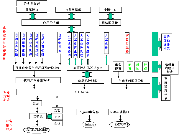 平臺部分完成系統(tǒng)的基本服務處理,不針對具體的服務業(yè)務,提供電話接入、呼叫控制、人工/自動服務、e_mail服務、WEB服務、SMSC服務等的基礎環(huán)境。業(yè)務部分完成系統(tǒng)的業(yè)務描述,按照平臺的業(yè)務接口,針對聯(lián)通1001客戶服務的每一個具體業(yè)務需要,開發(fā)相應的服務業(yè)務功能模塊或流程,實現(xiàn)系統(tǒng)的服務業(yè)務。業(yè)務部分完全建立在PAS-UCC平臺之上。