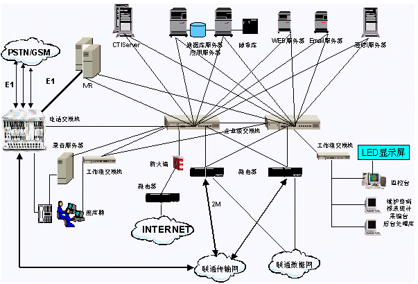 用戶撥打聯(lián)通客戶服務系統(tǒng)特服號碼1001,呼叫經(jīng)過電話網(wǎng)絡匯接到省中心匯接局,然后接入本系統(tǒng)。本系統(tǒng)的呼叫匯接采用《中國聯(lián)通客戶服務系統(tǒng)技術(shù)規(guī)范書》規(guī)定的匯接方式。