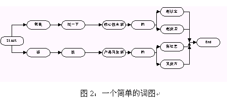 在語音識別中,語言模型是用來指導(dǎo)引擎進(jìn)行語音識別的,它限定了一個識別引擎所能表達(dá)的語句類型。在我們常用的圖搜索引擎中,語言模型是通過語法來表示的,語法是由一系列表示某個領(lǐng)域的語言表達(dá)方式的規(guī)則組成的(語法的具體書寫規(guī)則見引擎使用說明書)。這些規(guī)則會被被轉(zhuǎn)換成詞圖的形式然后用來指導(dǎo)語音的識別。所謂的詞圖是指由詞作為節(jié)點的一個圖,從該圖的開始節(jié)點到末尾節(jié)點的任一條路徑都是一個有效合法的句子。圖2給出了一個簡單的詞圖。