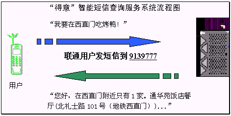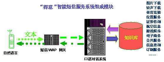 "得意"智能短信系統(tǒng)是在現(xiàn)有的數(shù)據(jù)通信和短信服務(wù)的技術(shù)平臺上,加入基于中文語言理解技術(shù)的"得意"口語對話系統(tǒng),從而能夠讓用戶在手機上以自然語言的形式享受指定領(lǐng)域的智能短信服務(wù)。智能短信系統(tǒng)對短信文本進行自動分析和理解,再從知識庫中提取用戶所需的信息,然后自動產(chǎn)生智能應(yīng)答語句,并以短信文本的形式發(fā)回用戶。由于"得意"口語對話系統(tǒng)具有上下文相關(guān)理解和人機混合主導(dǎo)等強大功能,在規(guī)定的領(lǐng)域內(nèi),用戶可通過一個或者多個短信構(gòu)成一組對話,完成復(fù)雜的信息查詢或者其他互動服務(wù)。