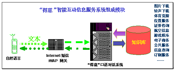"得意口語對話系統(tǒng)"可以充分滿足互聯(lián)網(wǎng)、短信、WAP等業(yè)務(wù)的智能互動信息服務(wù)需求,為SP和用戶提供了更易用、好用、實用的信息交流平臺。
