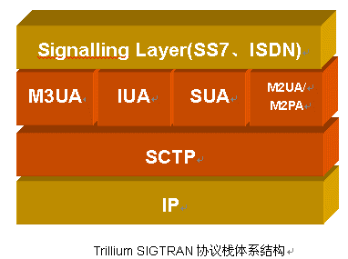如圖所示,Trillium可提供完整的SIGTRAN協議棧解決方案,包括SCTP、M3UA、M2UA、M2PA、SUA、IUA,其共同的特點如下: