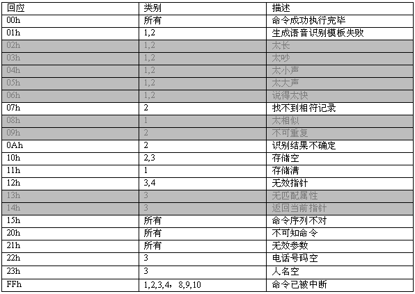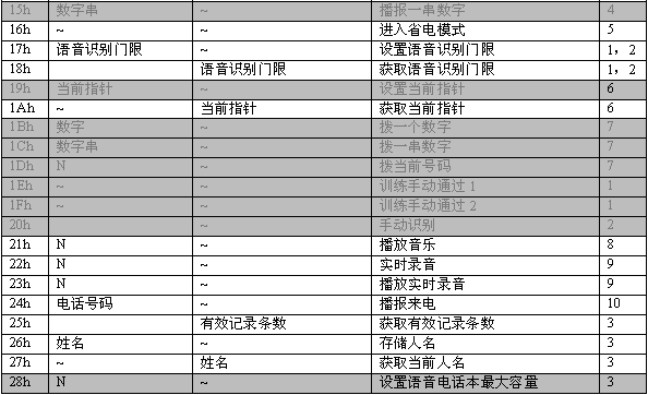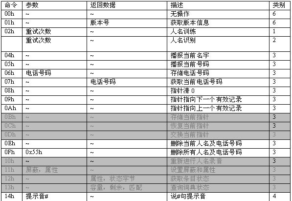 命令描述: 訓(xùn)練一個名字。當(dāng)增加一條電話本記錄時,應(yīng)先執(zhí)行此命令。該命令會生成一個語音模板,同時產(chǎn)生一個長達(dá)2秒的名字錄音。在此命令成功執(zhí)行之后,MCPU接著發(fā)送06h命令增加電話號碼。如果沒有執(zhí)行06h命令,則該項記錄電話號碼為空。