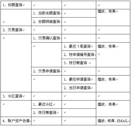 除了前文涉及到的受理投訴、建議、查詢申購地點(diǎn)等等關(guān)懷服務(wù)外,系統(tǒng)可提供以下關(guān)懷服務(wù):如何填寫開放式基金賬戶業(yè)務(wù)申請表、如何填寫開放式基金交易業(yè)務(wù)申請表、如何填寫開放式基金業(yè)務(wù)授權(quán)委托書等等。