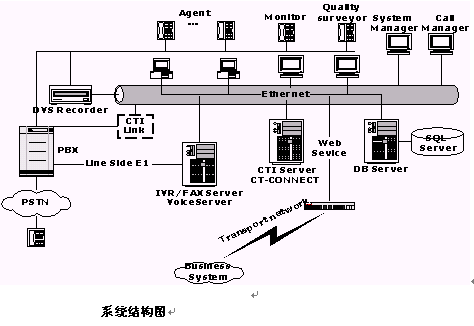 交換機(jī)實(shí)現(xiàn)電話呼入、呼出功能;還需要提供自動排隊(duì)機(jī)系統(tǒng),用于實(shí)現(xiàn)對來話的均衡分配;呼叫管理系統(tǒng),用于有效管理所有話務(wù);支持IVR;提供CTI Link模塊作為計(jì)算機(jī)/電話集成接口;同時,交換機(jī)還可作為辦公電話交換機(jī)使用,系統(tǒng)可支持多家公司的交換機(jī)。