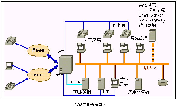 《政府呼叫中心系統(tǒng)》采用聲軟科技的《XCCP呼叫中心系統(tǒng)》平臺,主要由PBX交換機、CTI服務器、IVR系統(tǒng)、應用服務器、數(shù)據(jù)庫服務器、TTS系統(tǒng)和座席系統(tǒng)等硬件設備和系統(tǒng)應用軟件組成。它以電話服務為主要服務方式、結合計算機信息系統(tǒng)的資料數(shù)據(jù),為用戶提供全方位的服務。