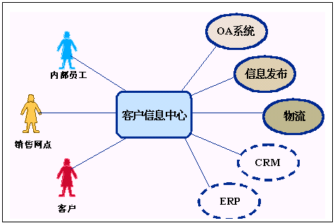 客戶信息中心有兩個(gè)層次的含義,首先它是一個(gè)信息中心,它應(yīng)該可以訪問到后臺(tái)現(xiàn)有的各種系統(tǒng),如OA系統(tǒng)、信息發(fā)布系統(tǒng)、物流系統(tǒng),同時(shí)它還應(yīng)該有良好的擴(kuò)展性,可以和未來的其它系統(tǒng)相銜接,比如CRM系統(tǒng)、ERP系統(tǒng)相接;其次它是一個(gè)圍繞客戶的信息中心,它應(yīng)該為客戶提供方便的信息交流手段,這就要求我們能夠通過多種媒介實(shí)現(xiàn)信息交互。