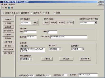 本鐵路客戶服務(wù)中心系統(tǒng)具有售票處/代售點(diǎn)等咨詢、列車信息等查詢、定票/退票/改票等業(yè)務(wù)受理、用戶投訴與建議、車次調(diào)整/貨物到站等信息自動(dòng)通知、客戶回訪與滿意度調(diào)查、語(yǔ)音信箱留言服務(wù)以及系統(tǒng)綜合管理等全方位功能;并且結(jié)合圖形化的管理、監(jiān)控界面,使得廣大旅客隨時(shí)隨地可以利用身邊的各種通訊工具享受到鐵路部門提供的各種信息服務(wù)。