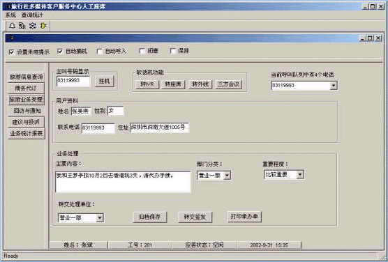 旅行社客戶服務(wù)中心系統(tǒng)將接入功能、導(dǎo)航功能、自動(dòng)語(yǔ)音查詢功能、人工座席服務(wù)功能、話路轉(zhuǎn)接功能、信息資料處理緊密聯(lián)系起來(lái)。用戶撥打特服電話號(hào)碼后,可以根據(jù)需要選擇人工服務(wù)、自動(dòng)語(yǔ)音查詢、自動(dòng)留言,并能夠在幾種服務(wù)中來(lái)回切換或轉(zhuǎn)接其它電話;所記錄的資料可以分門(mén)別類的進(jìn)行統(tǒng)計(jì)并形成報(bào)表,供相關(guān)部門(mén)進(jìn)行檢索查閱;意見(jiàn)處理完畢,可由座席主動(dòng)呼叫用戶,告知處理意見(jiàn),形成閉環(huán)處理流程;從而打造全新的客戶服務(wù)形象。