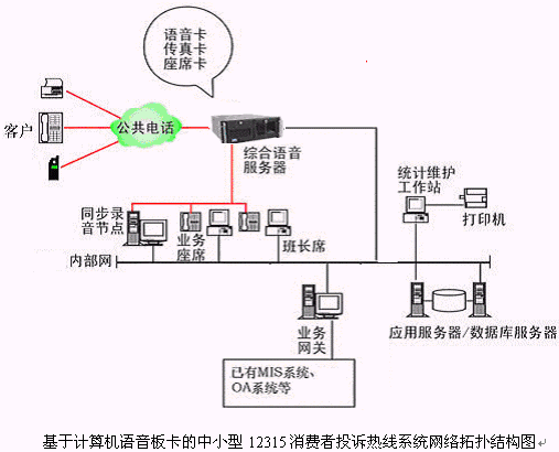 本系統(tǒng)物理結(jié)構(gòu)由帶語(yǔ)音板卡的高性能工控機(jī)(稱為綜合語(yǔ)音服務(wù)器,在功能上可以分為CTI服務(wù)器、IVR(交互式語(yǔ)音應(yīng)答)/IFR服務(wù)器、統(tǒng)計(jì)維護(hù)管理工作站、數(shù)據(jù)庫(kù)/應(yīng)用服務(wù)器、錄音留言工作站、業(yè)務(wù)網(wǎng)關(guān)服務(wù)器、業(yè)務(wù)代表座席、網(wǎng)絡(luò)系統(tǒng)等和應(yīng)用軟件構(gòu)成。