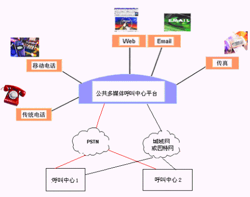 客戶利用電話、傳真、電子郵件、因特網(wǎng)、手機(jī)、短消息等進(jìn)入城市公共多媒體呼叫中心平臺,本系統(tǒng)依托現(xiàn)有各專業(yè)呼叫中心/使用城市公共多媒體呼叫中心平臺租賃服務(wù)的企事業(yè)單位的各類業(yè)務(wù)技術(shù)支持系統(tǒng)和網(wǎng)絡(luò)系統(tǒng),通過人工受理或自動(dòng)語音服務(wù)等方式全天24小時(shí)不間斷地為客戶提供各種服務(wù)。