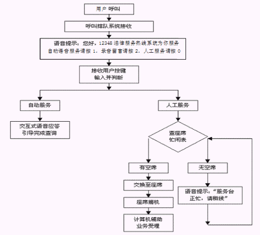 本系統(tǒng)將需轉(zhuǎn)入人工服務(wù)的用戶(電話)語音線路,根據(jù)一定的分配算法,將人民群眾打入的電話合理地分配給后臺(tái)的座席操作人員進(jìn)行處理,使系統(tǒng)的工作得以合理的分配。