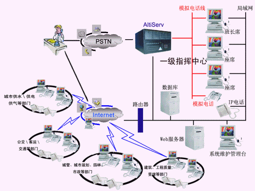 在建設(shè)12319時(shí),將整個(gè)熱線系統(tǒng)構(gòu)架分成三級(jí)網(wǎng)絡(luò)結(jié)構(gòu),一級(jí)網(wǎng)絡(luò)指揮中心為城市提供了一個(gè)電子化(語(yǔ)音、Internet等)的服務(wù)窗口,它是以12319作為電話接入的系統(tǒng)號(hào)碼,幫助城市改善傳統(tǒng)的服務(wù)方式,為市民提供多種渠道和政府進(jìn)行溝通,該級(jí)系統(tǒng)建立在奧迪堅(jiān)AltiServ平臺(tái)之上,采用多路并發(fā)IVR自動(dòng)語(yǔ)音應(yīng)答資源,各城市可以進(jìn)行依據(jù)自己的需要進(jìn)行個(gè)性化的IVR應(yīng)用,為用戶提供人工接聽(tīng)及語(yǔ)音自助服務(wù)。除此之外,在一級(jí)網(wǎng)絡(luò)指揮系統(tǒng),AltiServ的IP分布式呼叫中心平臺(tái)還提供一系列先進(jìn)功能,其中包括:自動(dòng)話務(wù)分配、VoIP功能、語(yǔ)音信箱、文本轉(zhuǎn)語(yǔ)音(TTS)、電話會(huì)議、錄音管理、CDR(通話詳細(xì)報(bào)告)等,方便指揮中心集中受理群眾建議,發(fā)布指令以及發(fā)揮監(jiān)督等作用。