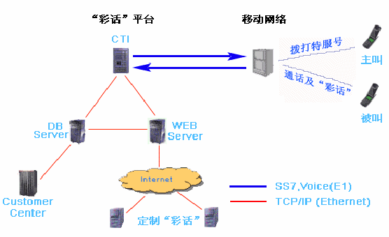 彩話業(yè)務(wù)與CRBT技術(shù)原理基本相同,當(dāng)呼叫進(jìn)入交換機(jī)后,獲取呼叫的主被叫信息后,由交換機(jī)同時(shí)發(fā)起兩個(gè)呼叫,一個(gè)去真正被叫,另一個(gè)去彩話系統(tǒng)。當(dāng)被叫方摘機(jī),首先控制主叫與被叫接通,彩話系統(tǒng)根據(jù)被叫用戶保存的定制的彩話信息和業(yè)務(wù)邏輯控制彩話系統(tǒng)的IVR單元對(duì)主被叫的通話進(jìn)行相應(yīng)的背景語(yǔ)音播放操作,該語(yǔ)音僅作為背景音樂,不影響正常的雙方通話,類似于作一個(gè)三方會(huì)議的操作。當(dāng)被叫掛機(jī)時(shí),交換機(jī)將IVR單元和被叫的連接斷開。