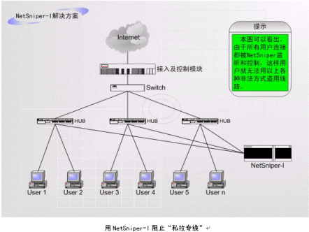 (4)"NetSniper網(wǎng)絡(luò)尖兵"使用起來非常方便,和運(yùn)營(yíng)商現(xiàn)有的設(shè)備配合極其簡(jiǎn)單:不需要改變現(xiàn)有的網(wǎng)絡(luò)結(jié)構(gòu)、不影響網(wǎng)絡(luò)的性能、與用戶無關(guān)、集中維護(hù)、控制模式靈活。