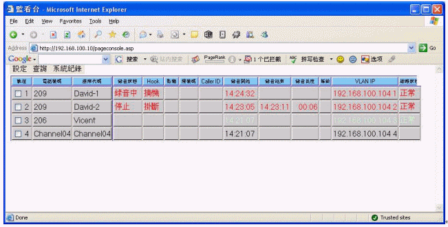 監(jiān)看臺:系統(tǒng)登入后的主畫面,可以監(jiān)控各路電話的當前使用情況(包括來電號碼、去電號碼、振鈐次數(shù)、錄音開始時間、錄音結束時間、線路狀況等信息)。并可以實現(xiàn)對任意通話的網絡實時監(jiān)聽。