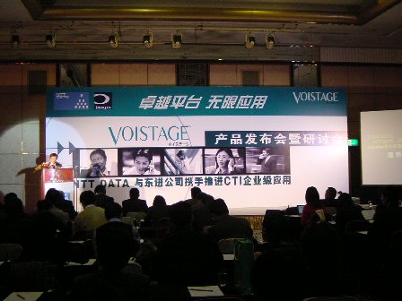 2004年2月19日,NTT DATA(中國)有限公司在北京長富宮飯店舉行了主題為"卓越平臺,無限應(yīng)用"的VOISTAGE產(chǎn)品發(fā)布及應(yīng)用研討會,在會上發(fā)布了CTI產(chǎn)品VOISTAGE。來自日本NTT DATA總公司的高層在會上發(fā)表主題演講時表示,NTT DATA將與戰(zhàn)略合作伙伴東進公司攜手共同大力推進VOISTAGE產(chǎn)品在中國中小企業(yè)級市場中的應(yīng)用。