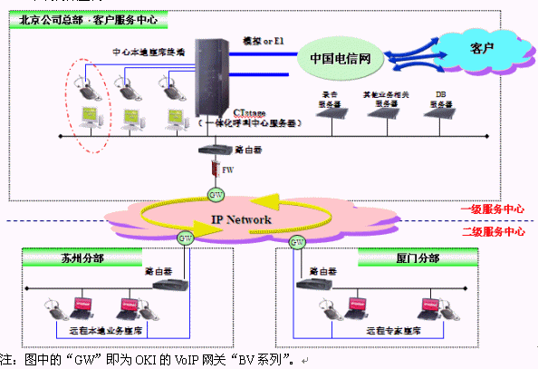 另一方面,OKI則擁有構(gòu)筑大規(guī)模IP電話的豐富經(jīng)驗,從最初的窄帶網(wǎng)絡(luò)到最近的寬帶網(wǎng)絡(luò),OKI一直在提供著最適合使用用戶環(huán)境的、追求音質(zhì)的VoIP產(chǎn)品。伴隨著寬帶網(wǎng)絡(luò)在企業(yè)市場中日益深入的運(yùn)用,及呼叫中心市場中呈現(xiàn)的最新需求,OKI充分將IP技術(shù)運(yùn)用到呼叫中心系統(tǒng)中,推出IP型分散客服中心解決方案。所謂分散型系統(tǒng),是指用網(wǎng)絡(luò)將分散在各個點(diǎn)的多個呼叫中心連接起來,作為一個大規(guī)模中心統(tǒng)一運(yùn)用的系統(tǒng)。