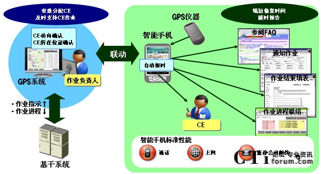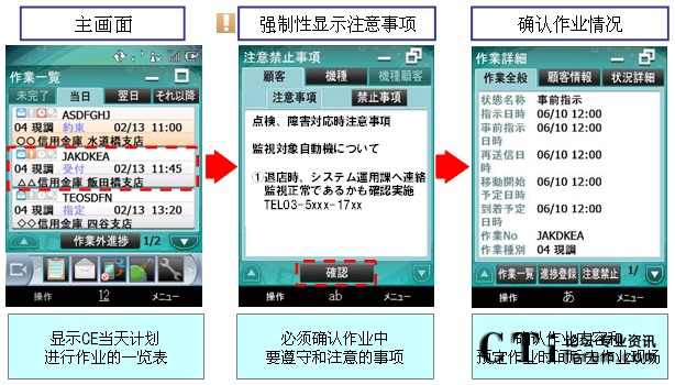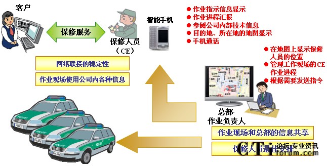 “MoBiz AP for CE支持系統(tǒng)”是在支持保修人員在工作現場作業(yè)的同時,實現總部對工作現場“可視化”管理的應用程序軟件包。