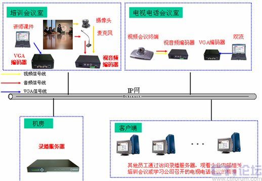 由于視頻會議系統(tǒng)沒有覆蓋公司內(nèi)所有的會議室,因此這些會議室召開的會議就無法進行直播,而借助于多媒體錄播系統(tǒng)就可以很好的解決這一缺陷。通常將這些會議室中的攝像頭和麥克風接入到視音頻編碼器上,將講師電腦上的培訓課件(如PPT,Word等文檔)內(nèi)容接入到VGA編碼器上,兩者將采集到的信號通過網(wǎng)絡發(fā)給錄播服務器,由錄播服務器進行處理后直播到各個客戶端,就可以很方面的對于任意一個會議室召開的會議進行錄播,隨時隨地對員工傳達會議精神。