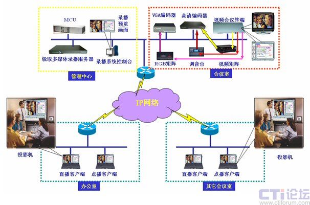 如圖所示:多媒體錄播服務(wù)器放置在管理中心,高清編碼器(采集高清視頻及聲音)及VGA編碼器(采集雙流信號(hào))放置在會(huì)議室,客戶端可以是網(wǎng)絡(luò)內(nèi)的任意一臺(tái)計(jì)算機(jī)。整個(gè)系統(tǒng)簡(jiǎn)單明了,分布靈活,部署簡(jiǎn)單,系統(tǒng)只要連接了信號(hào)線,配置了IP地址即可投入使用,無(wú)須專業(yè)布線。各部分配置如下:
