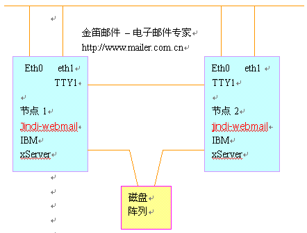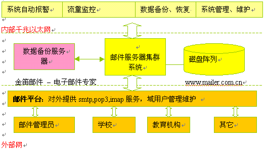 本項目采用金笛集群郵件系統,通過兩臺IBM PC服務器實現高可用性。支持SMTP, POP3,IMAP等主流協議,支持WebMail,支持郵件列表等功能,同時要求兼容性好,與網站其他業(yè)務系統沒有沖突。