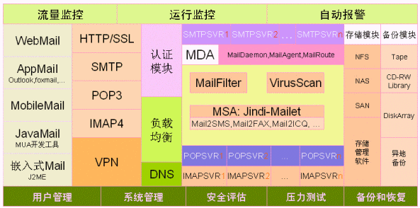 1. 郵件集群系統由二個smtp server、一個pop3/imap server、一個認證服務器ldap、和磁盤陣列組成。監(jiān)控中心由流量監(jiān)控、運行監(jiān)控、SMS報警、系統管理、查詢運維終端組成。