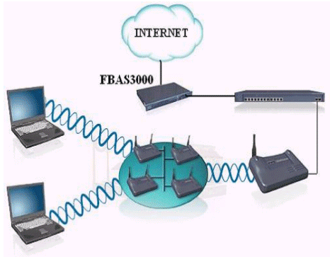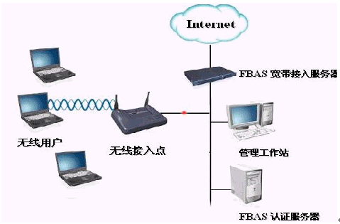 移動用戶通過自身的無線網(wǎng)卡傳遞信息到熱點(diǎn)接收器上,熱點(diǎn)接收器連接到交換機(jī)(是為了能具有更好的可拓展性),交換機(jī)連接到華夏科技FutureWorks寬帶計(jì)費(fèi)系統(tǒng)的FBAS接入服務(wù)器上,通過接入服務(wù)器連接到INTERNET.這里的FBAS3000系列的寬帶接入服務(wù)器采用的是一體機(jī)的模式,接入,認(rèn)證,計(jì)費(fèi)等一系列服務(wù)均安裝在FBAS里,這樣可以簡化網(wǎng)絡(luò)結(jié)構(gòu)。對FBAS的操作是通過WEB頁面來進(jìn)行設(shè)置維護(hù)的,